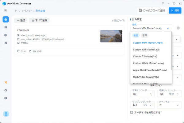 動画と音声形式間の変換動画から動画、動画から音声への変換する。 |